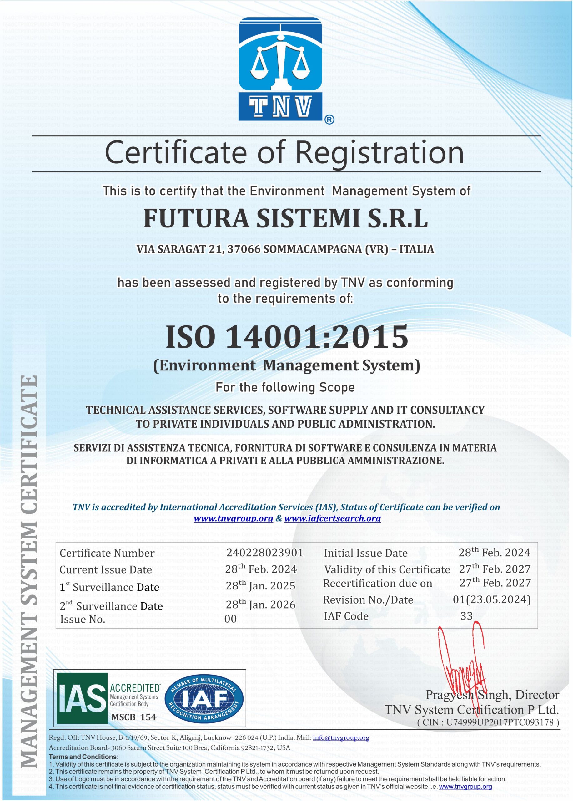 Pertanto, FUTURA SISTEMI S.R.L. ha implementato e si impegna a mantenere i requisiti di Qualità, Ambiente e Sicurezza delle Informazioni in conformità delle norme UNI EN ISO 9001:2015 – UNI EN ISO 14001:2015 – UNI EN ISO 27001:2016 – UNI EN ISO 27017:2015 – UNI EN ISO 27018:2019 per il campo di applicazione “SERVIZI DI ASSISTENZA TECNICA, FORNITURA DI SOFTWARE E CONSULENZA IN MATERIA DI INFORMATICA A PRIVATI E ALLA PUBBLICA AMMINISTRAZIONE“.
