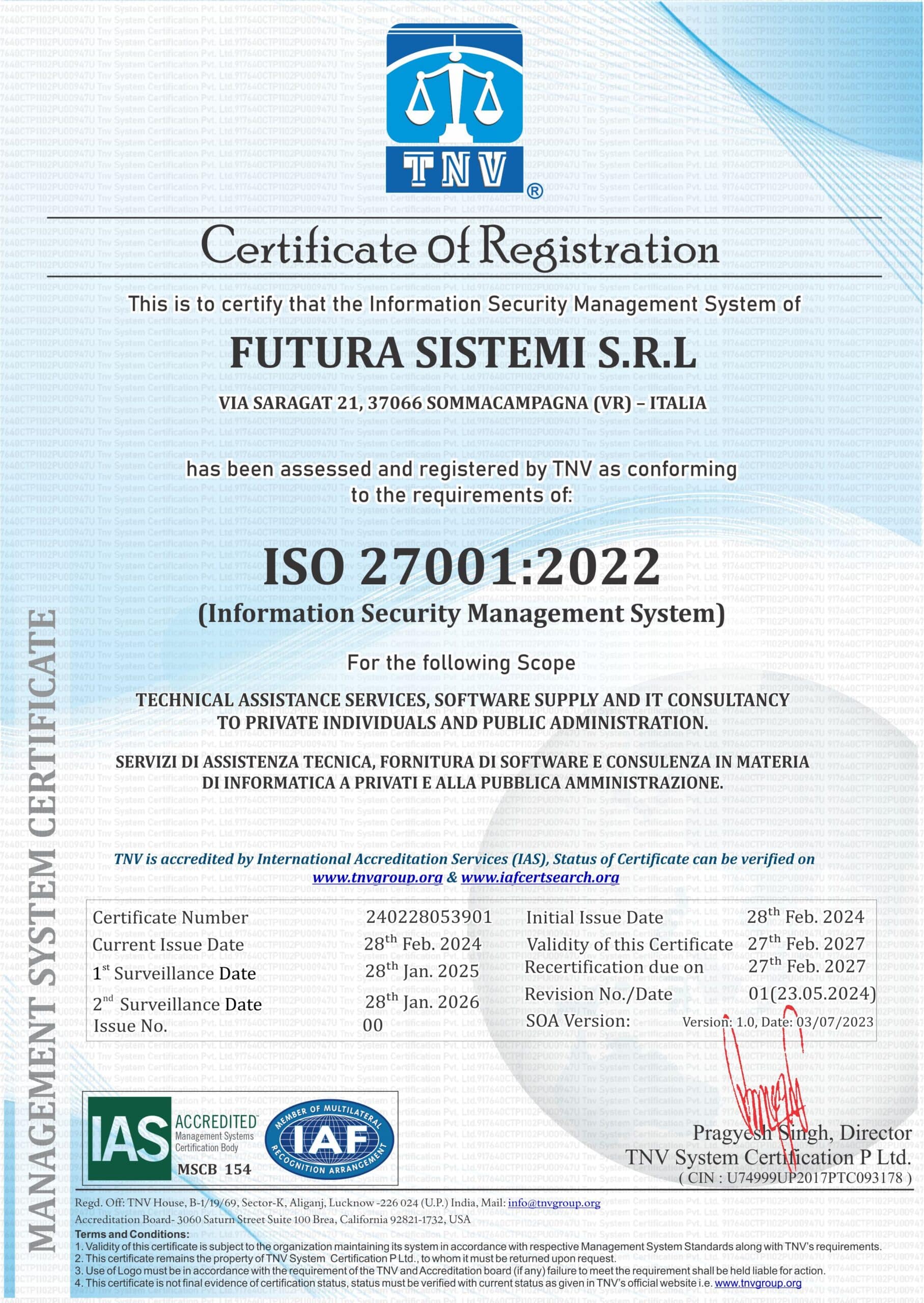 | ISO 9001:2015 – ISO 14001:2015 – ISO 27001:2022 – ISO 27017:2015 – ISO 27018:2019 | |||||